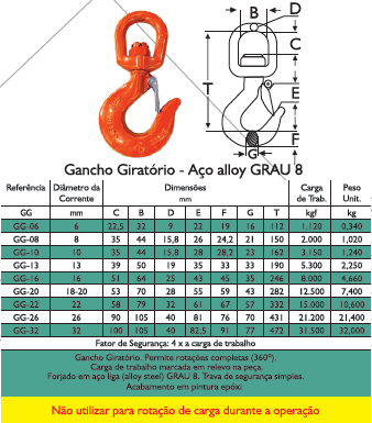 Forjado em Aço Carbono Grau 8, possui trava de segurança, que evita acidentes na operação. É utilizado para diversas finalidades, conforme a carga que necessita movimentar.