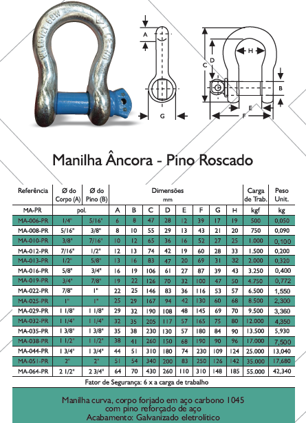 Manilha Âncora, corpo forjado em aço Carbono 1045, com pino reforçado em aço aço Alloy.
