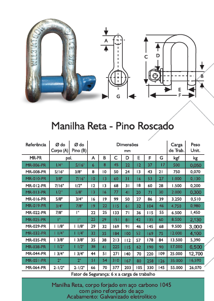 Manilha reta, corpo forjado em aço Carbono 1045 com pino reforçado de aço.