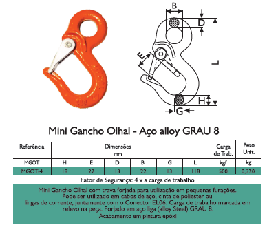 Mini Gancho Olhal com trava forjada para utilização em pequenas furações .